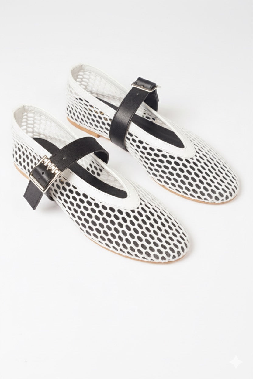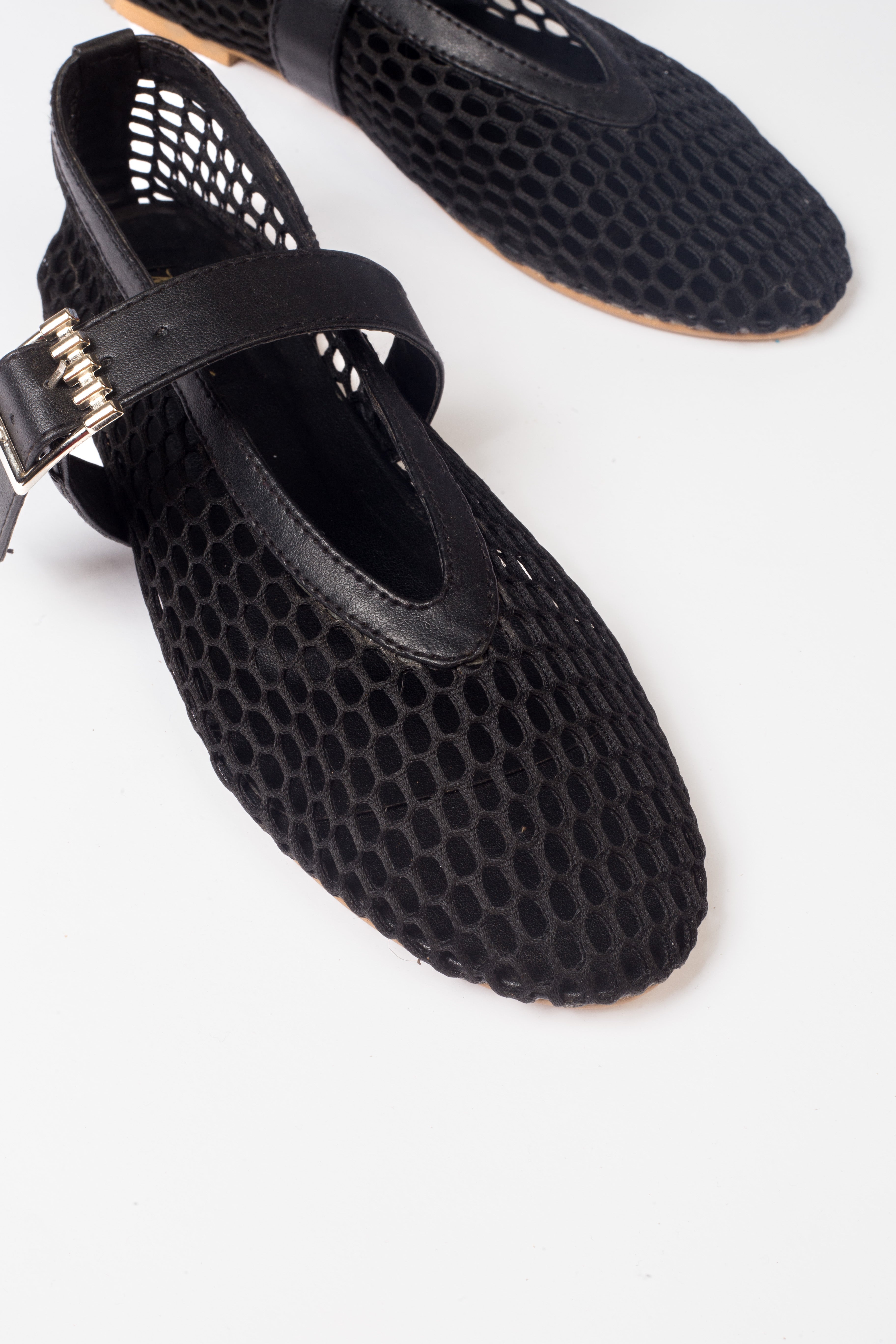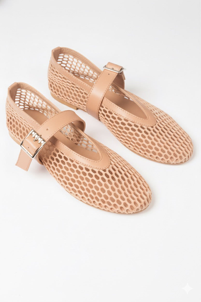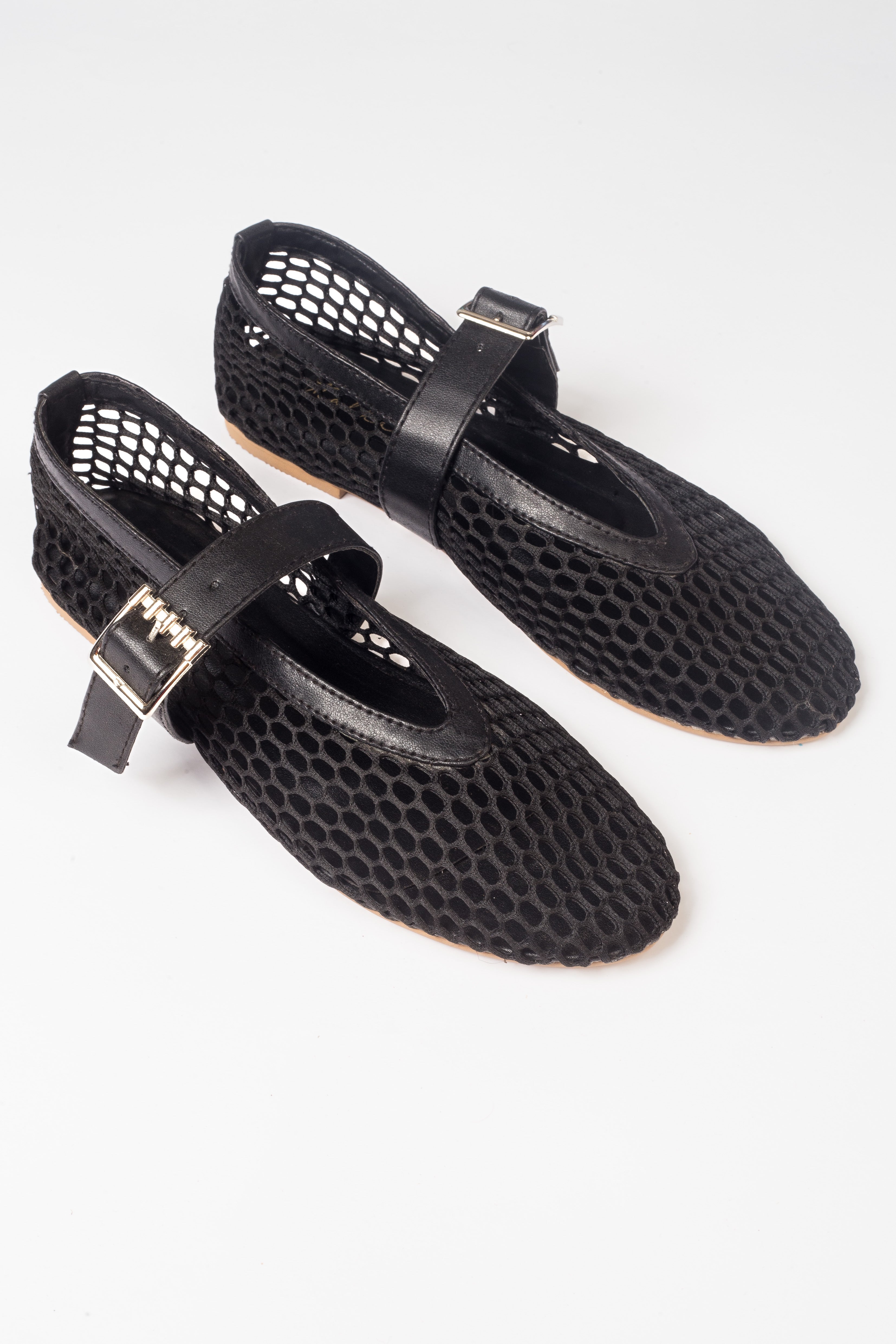 Alia is a refined Mary Jane ballet flat featuring breathable mesh material that ensures comfort and ventilation. Its delicate embellishments add a sophisticated touch, perfect for elevating both casual and formal outfits. Designed with an expert balance of style and practicality, this flat offers secure fit and graceful silhouette for everyday elegance.