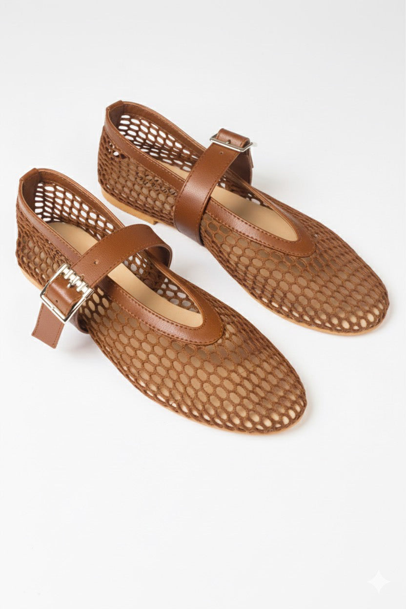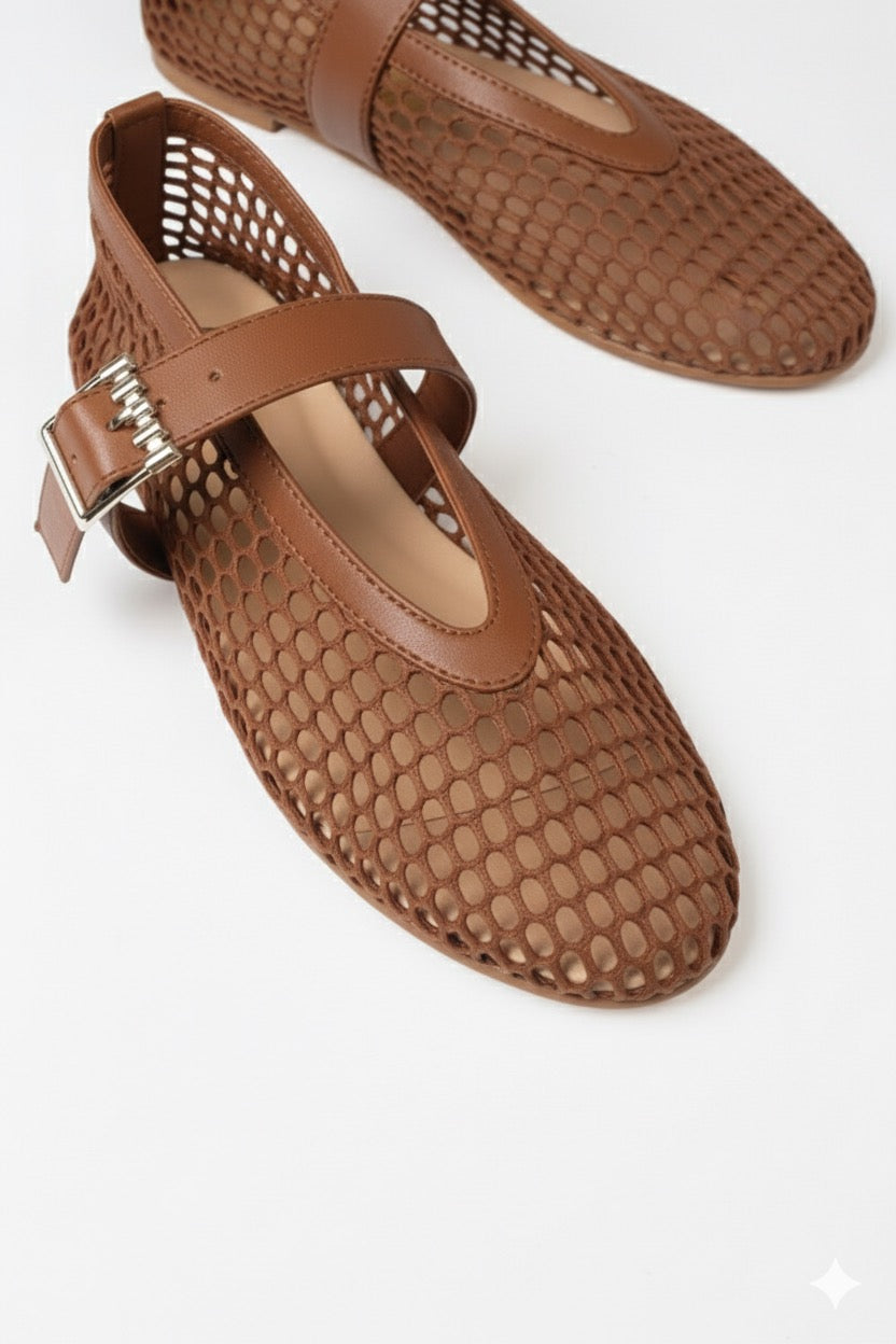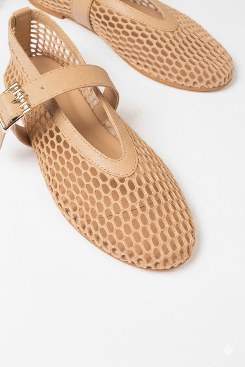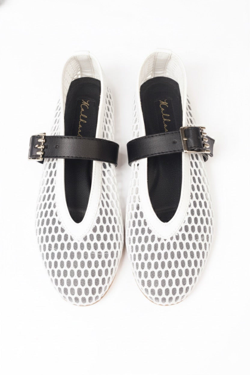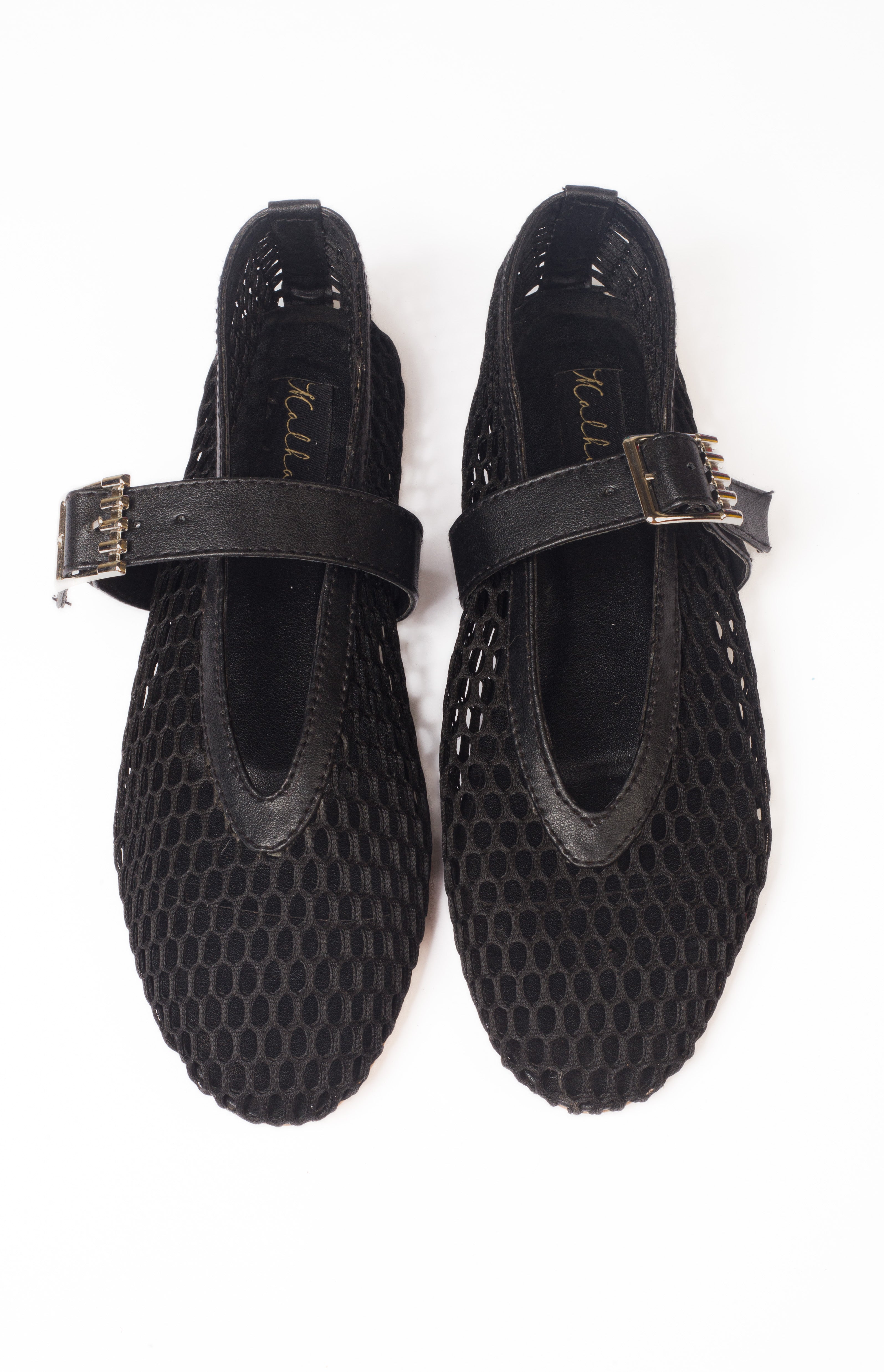 Alia is a refined Mary Jane ballet flat featuring breathable mesh material that ensures comfort and ventilation. Its delicate embellishments add a sophisticated touch, perfect for elevating both casual and formal outfits. Designed with an expert balance of style and practicality, this flat offers secure fit and graceful silhouette for everyday elegance.